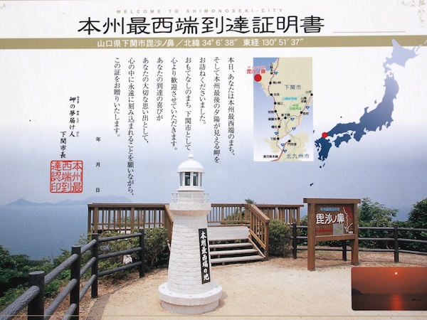 それから10年後の「50代編日本一周」(1999年)でも本州最西端の地に立った。驚いたことに国道191号の入口には「本州最西端の地」の道標が立ち、岬への道の途中には案内板が立っていた。岬名は「毘沙ノ鼻」になっていた。その入口には駐車場ができ、岬の突端には展望台ができていた。毘沙ノ鼻の展望台からキラキラと輝く日本海を眺め、目の前に浮かぶ蓋井島を眺めたのだった。