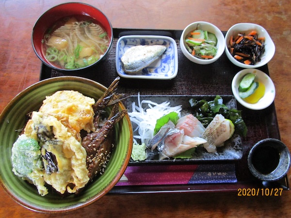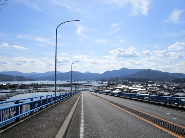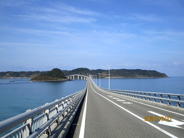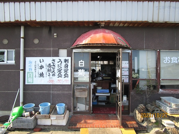 毘沙ノ鼻を後にし、国道191号を行く。難解地名の特牛(こっとい)を通り、角島大橋を渡って角島に寄り、11時、長門市に到着。ここでは仙崎漁港の食堂「春菊」で刺身付の「いわし丼」を食べた。イワシの刺身は鮮度満点。いわし丼のイワシは味醂漬。そのあと青海大橋で青海島に渡り、仙崎に戻った。