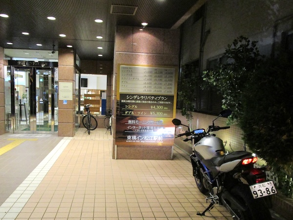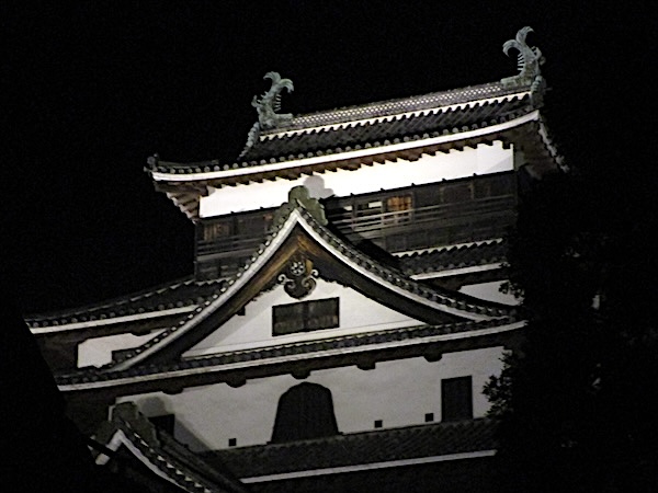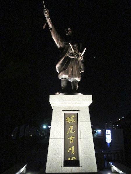 出雲大社まで戻ると国道431号で松江へ。夜の松江に到着すると、松江城を見る。松江城は現存12天守のひとつで、さらに松本城、犬山城、彦根城、姫路城とともに国宝5城になっている。ここには松江城を築いた堀尾吉晴像が建っている。