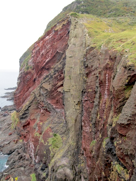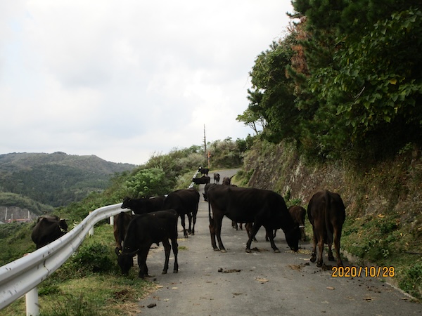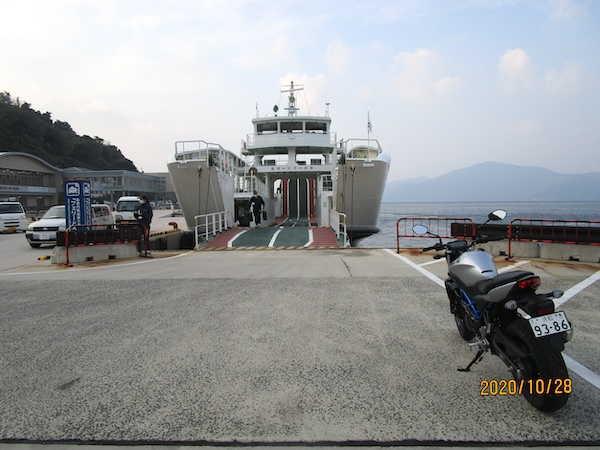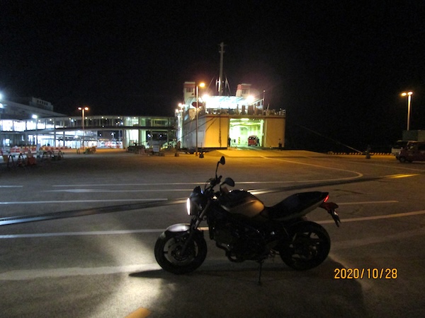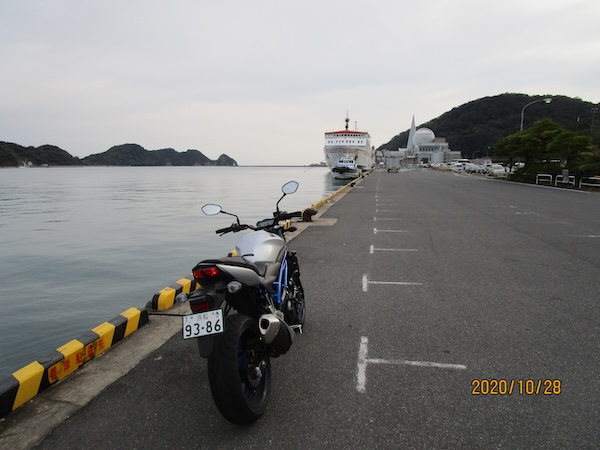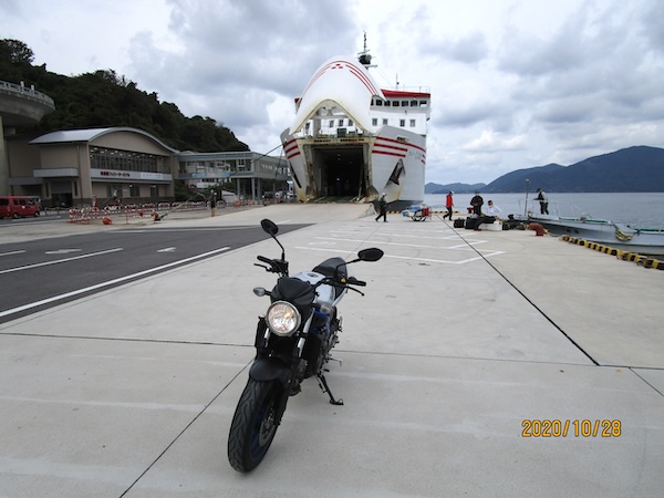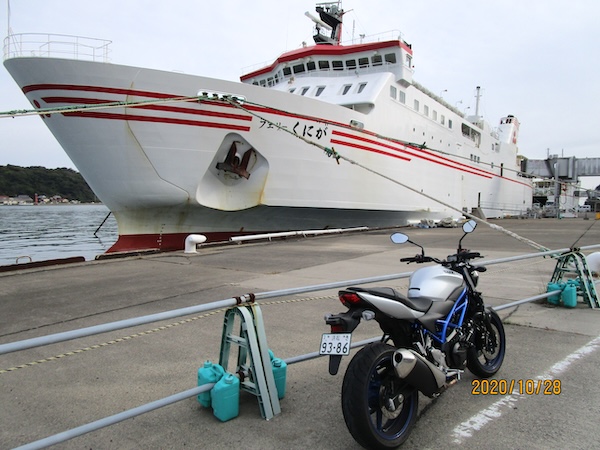 地蔵岬で折り返し、県道2号から国道485号で七類港へ。9時30分発の隠岐汽船のフェリー「くにが」に乗船。知夫里島へ。来居港に着いたのは11時30分。SV650で知夫里島をまわった。隠岐牛との出会い。名所の「知夫赤壁(ちぶせきへき)」や高平山の知夫里島灯台を見て、小さな島津島にも渡った。