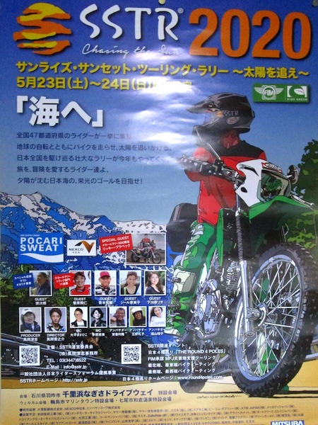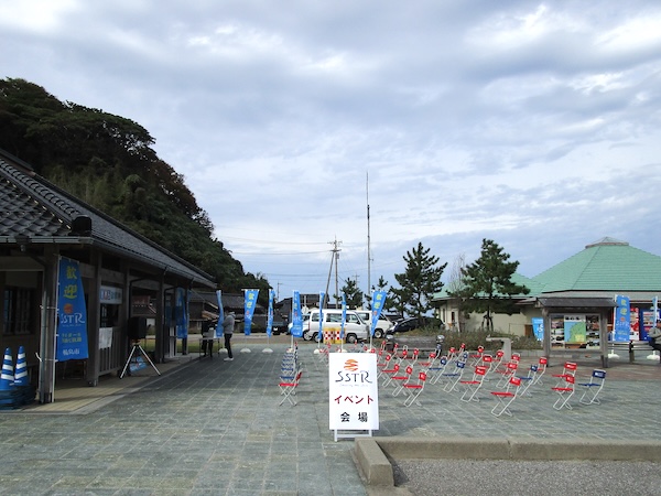 道の駅「赤神」の特設会場でのSSTRのイベント開始。風間深志さんと賀曽利隆の1時間以上に及ぶ熱烈トークでは参加者の皆さんから盛大な拍手喝采をいただいた。