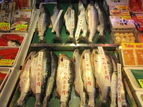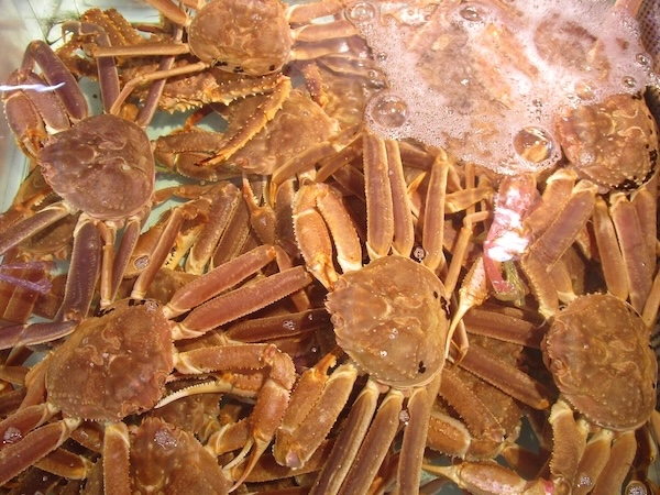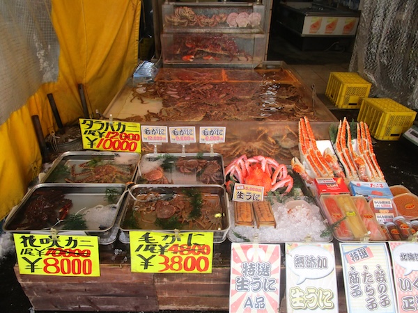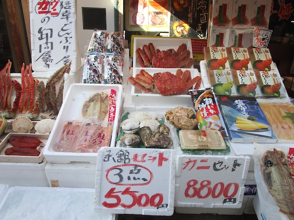 朝食を食べると朝市を歩く。カニが目につく。タラバガニと毛ガニ。根室の花咲ガニも売られている。ホタテ、カキ、ハマグリの貝3点セットや筋子、たら子、数の子の魚卵3点セットも北海道らしい。ズラリと並んだ北洋産の紅鮭は壮観だ。