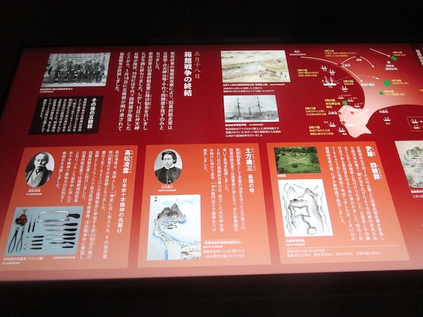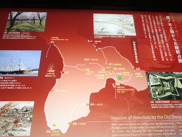 五稜郭の中にある箱館奉行所(500円)を見学。この建物は2010年に復元された。館内には新政府軍と旧幕府軍が戦った戊辰戦争(1868年〜1869年)最後の箱館戦争が詳しく紹介されている。この戦争で新選組副長の土方歳三は戦死した。