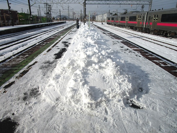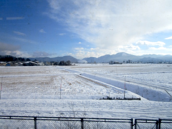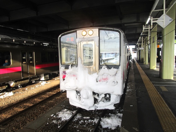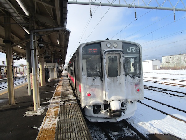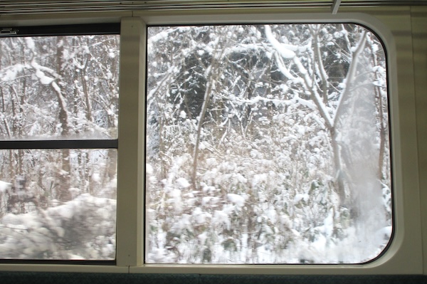 9時02分、弘前発。電車は津軽平野の雪原を走り、大鰐温泉駅を通り、碇ヶ関駅を過ぎると山中に入っていく。