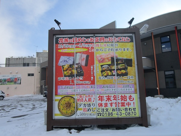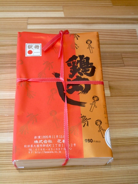 トンネルで矢立峠を抜け出ると秋田県。列車は大館盆地へと下り、9時44分、終点の大館駅に到着。次の秋田行まで1時間以上あるので、駅前の「花善」で名物駅弁の「鶏めし弁当」(980円)を買って食べた。鶏飯と鶏肉の絶妙な取り合わせ。