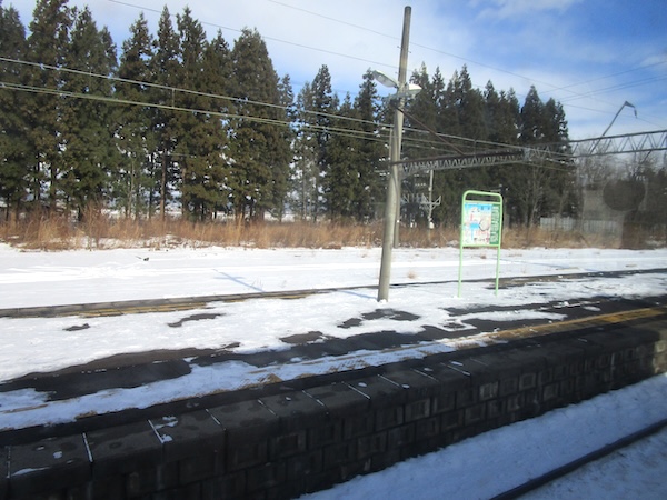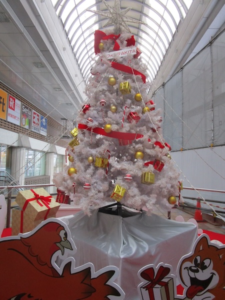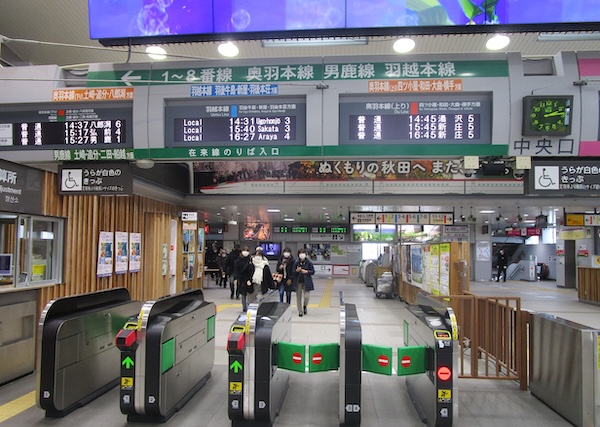 12月21日。大館始発10時37分の秋田行に乗った。4両編成の電車。鷹ノ巣、二ツ井、東能代、追分、土崎と通り、12時26分、秋田に到着だ。なまはげや秋田犬「マサル」のぬいぐるみのお出迎え。