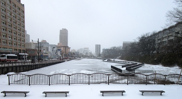 久保田城址へ。堀には氷が張り、その上に雪が積もっている。