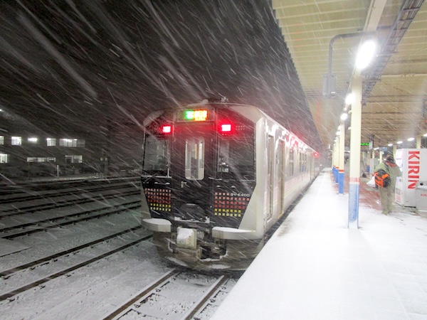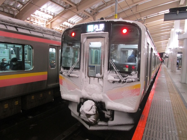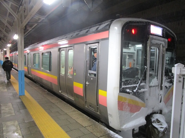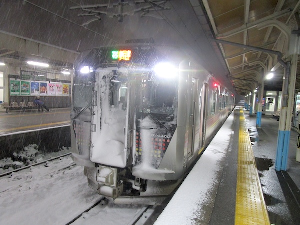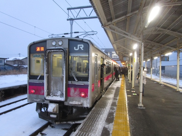 列車は山形県に入り、17時26分、酒田駅に到着。ここで新津行に乗り換える。2両編成のディーゼルでワンマン。ほぼ満員の乗客を乗せて17時36分に発車。鶴岡でかなりの乗客が降り、かなりの乗客が乗ってくる。大半は高校生だ。酒田では激しく雪が降っていたが、鶴岡では雪は舞う程度。それほど離れていないのに、酒田と鶴岡の違いはおもしろい。