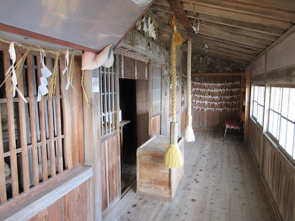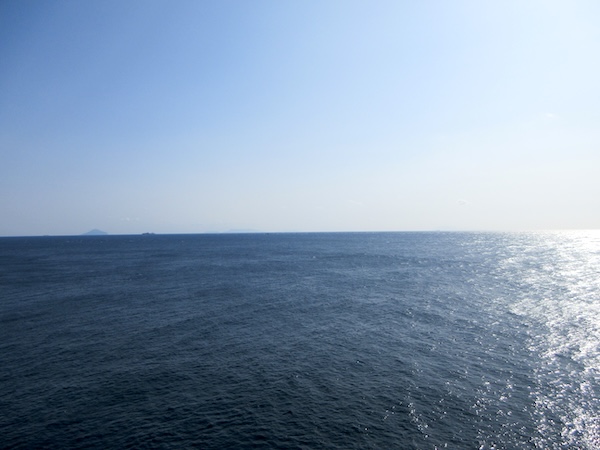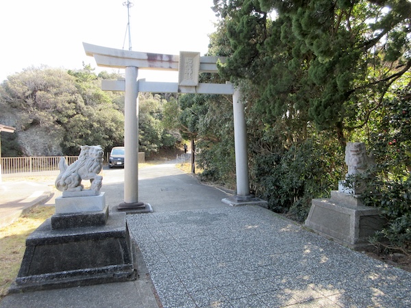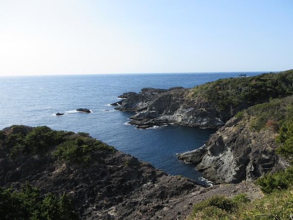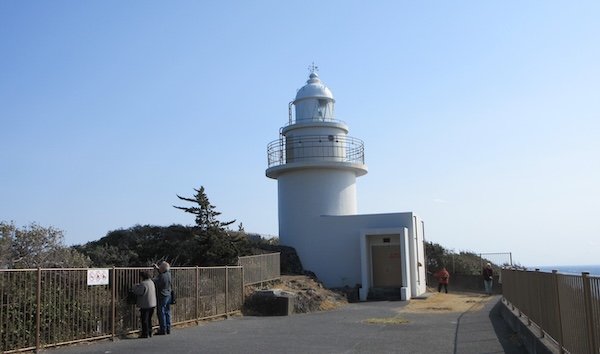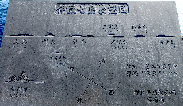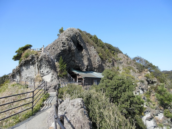 石廊崎に到着すると駐車場(有料)にSXを止め、観光施設の「オーシャンパーク」でコーヒーを飲み、岬の突端へと歩いていく。石室(いろう)神社の鳥居をくぐり、石廊埼灯台を見る。そして石室神社を参拝し、岬の突端に立つ。ここには熊野神社の祠が祀られている。水平線上に目を向けると、利島がはっきりと見え、新島と神津島は霞んでいる。三宅島はもう見えない。