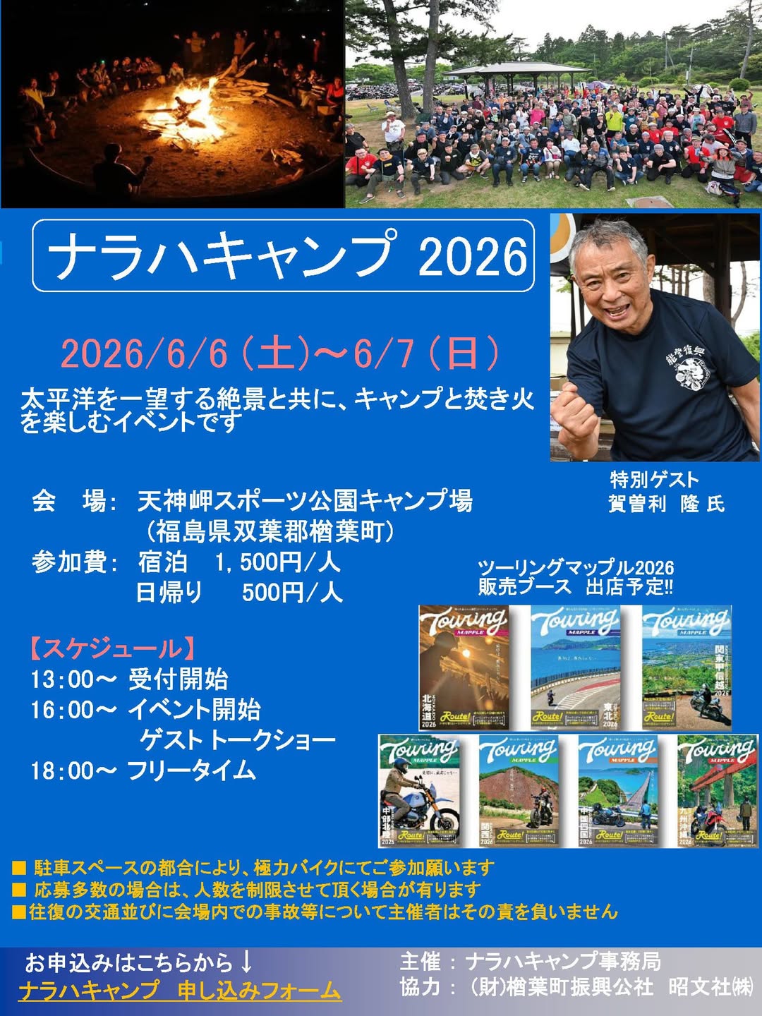 今年も太平洋を望む絶景のキャンプ場で、キャンプと焚き火を楽しむイベント「ナラハキャンプ 2026」の開催が決定しました。会場は昨年と同様福島県の天神岬スポーツ公園、太平洋を一望できる素敵なキャンプ場です。詳細は下記の通り、今年も賀曽利隆が特別ゲストとして参加します。